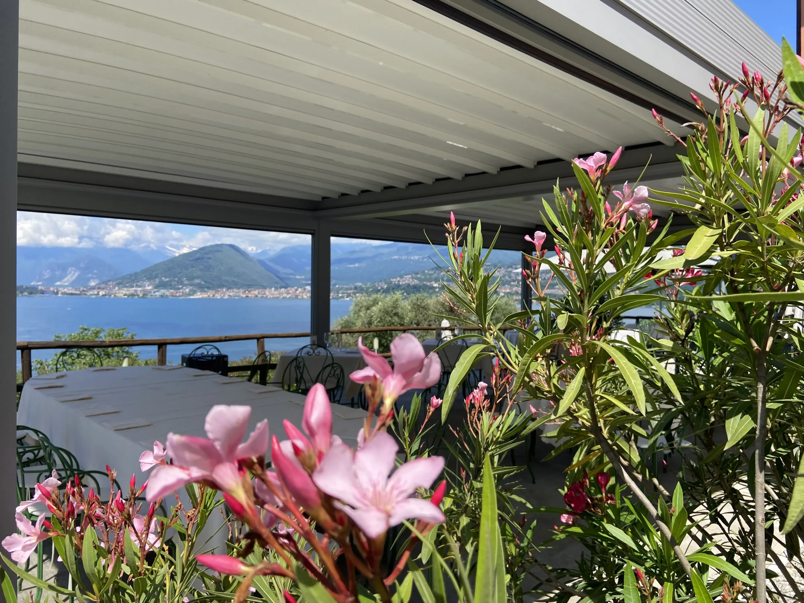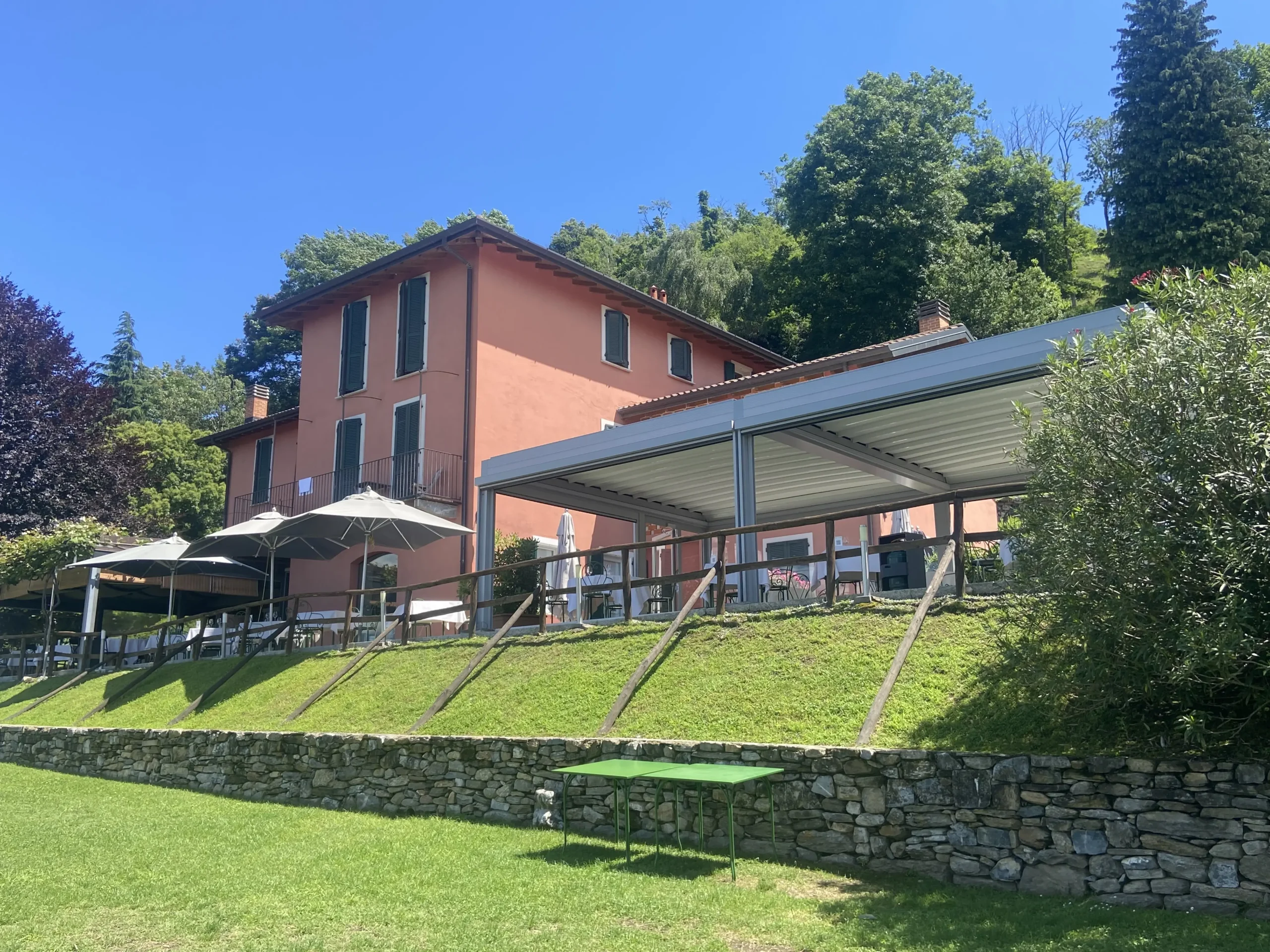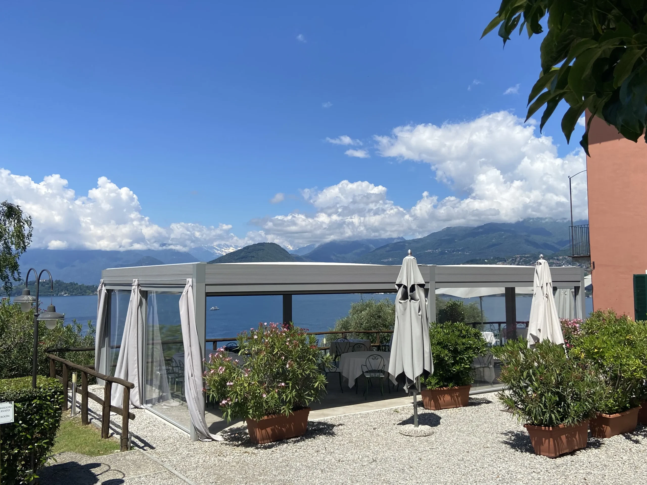 Valorizzare lo spazio esterno, direttamente affacciato come fosse una balconata sulle sponde del Lago Maggiore, è l’intervento realizzato su richiesta dello chef Luigino Pavanello per ampliare la capacità ricettiva del ristorante avendo una visuale mozzafiato. L’intervento effettuato ha previsto la creazione di una veranda da utilizzare durante il caldo periodo estivo per proteggere i commensali dai raggi del Sole ma anche nella mezza stagione garantendo un utilizzo come giardino d’inverno; le linee moderne ed essenziali si integrano perfettamente con l’architettura tradizionale della Locanda, limitando l’impatto paesaggistico di una grande spazio coperto quale è il manufatto costruito.